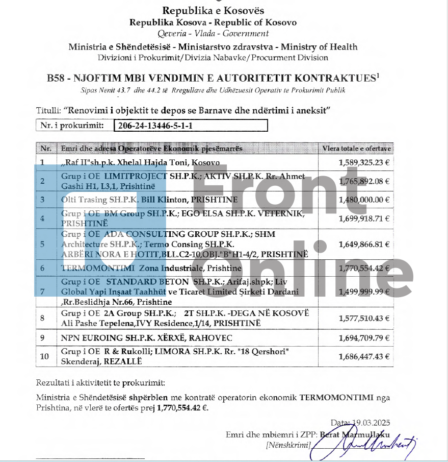 Ministria e Shëndetësisë e cila drejtohet nga Arben Vitija për tenderin Renovimi i objektit te depos se Barnave dhe ndërtimi i aneksit në të cilën kishin aplikuar 11 kompani ka rekomanduar për kontratë kompaninë që ka ofertuar me çmimin më të lartë se sa të gjitha kompanitë që ishin në garë, raporton Front Online .