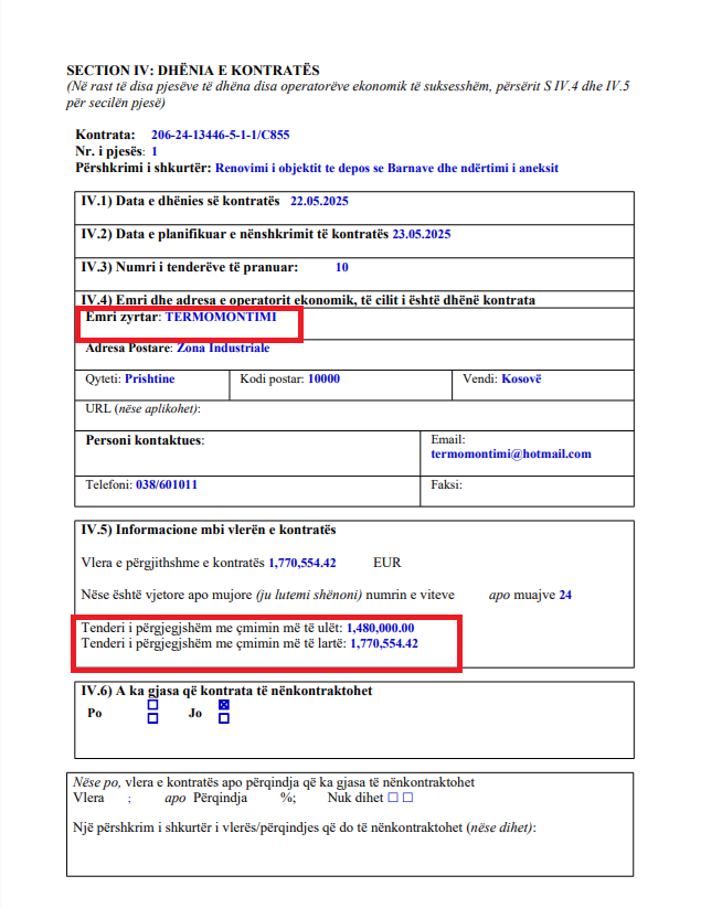 e specifikuar ne Nenin I te këtij Njoftimi për dhënie te kontratës./ Front Online /