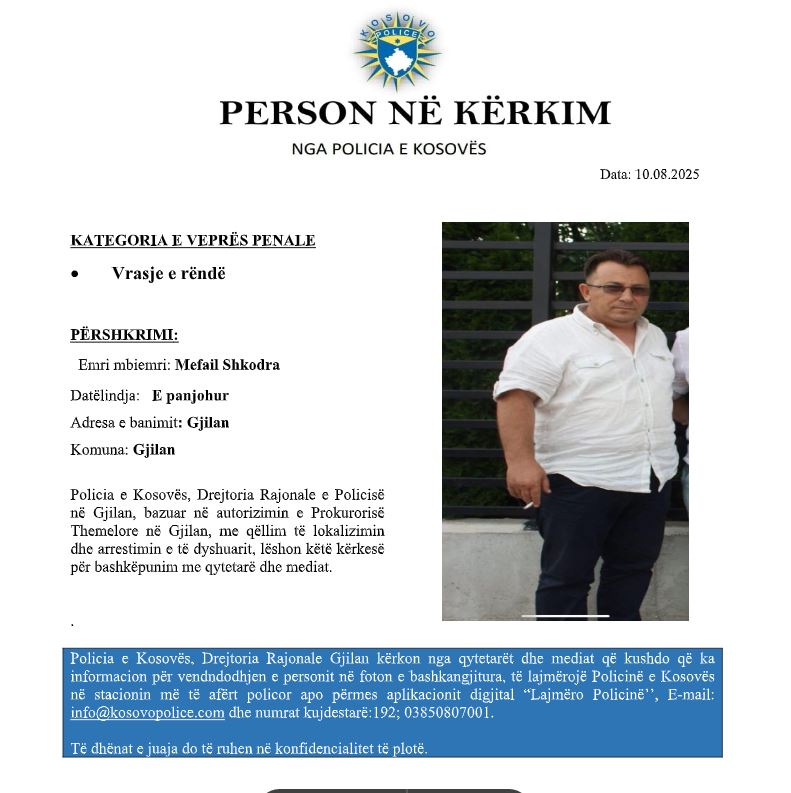Policia e Kosovës, Drejtoria Rajonale e Policisë në Gjilan, bazuar në autorizimin e Prokurorisë Themelore në Gjilan, me qëllim të lokalizimin dhe arrestimin e të dyshuarit, lëshon këtë kërkesë për bashkëpunim me qytetarë dhe mediat.