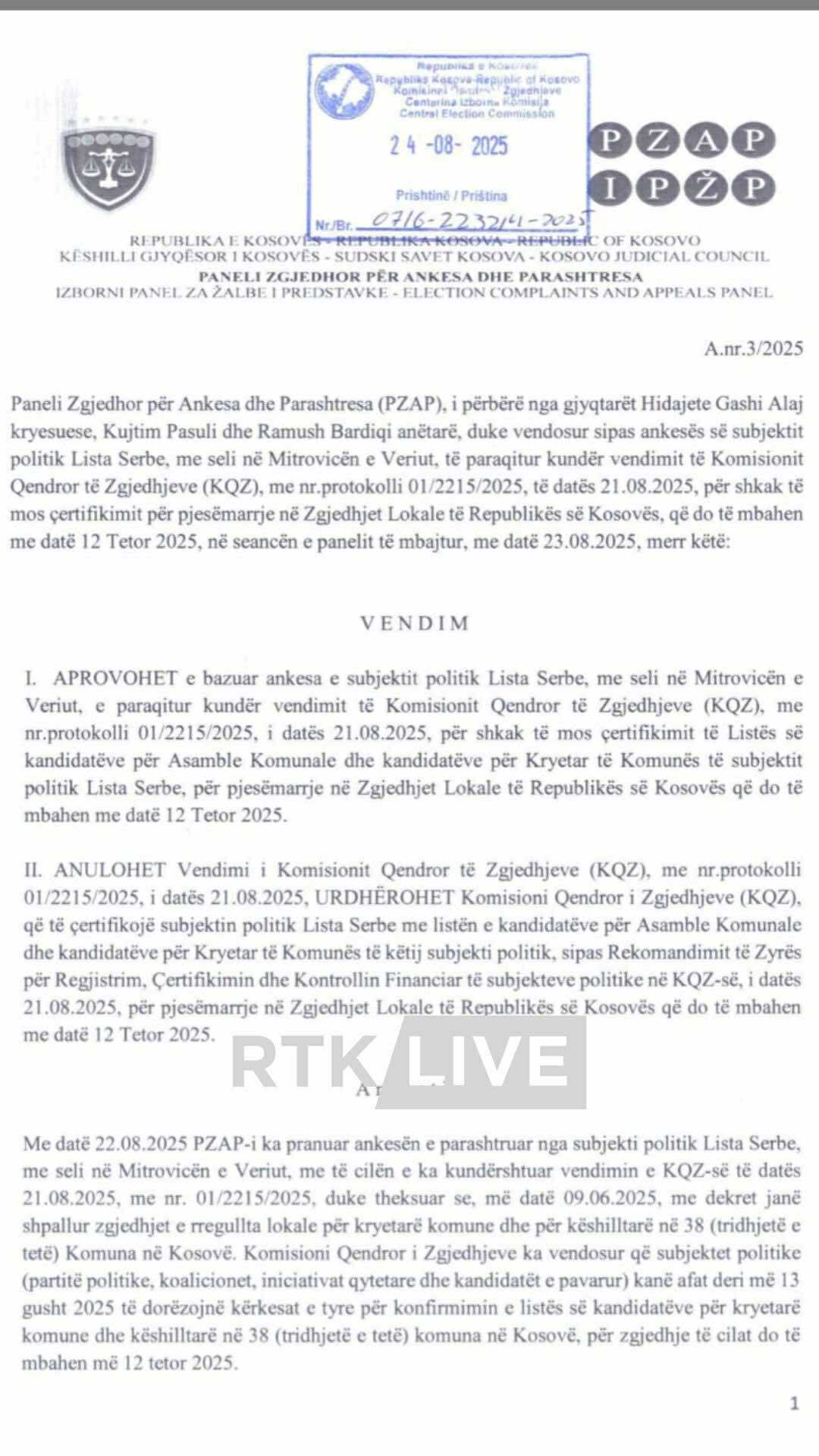 Paneli Zgjedhor për Ankesa dhe Parashtresa (PZAP) ka marrë vendim në favor të subjektit politik Lista Serbe, duke aprovuar ankesën e këtij subjekti kundër vendimit të Komisionit Qendror të Zgjedhjeve (KQZ) për moscertifikimin e listës së kandidatëve të saj për zgjedhjet lokale të 12 tetorit 2025.