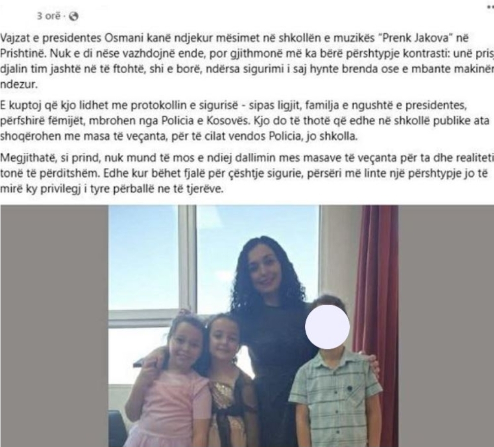 Një prind ka ndarë përvojën e saj personale në rrjetet sociale, duke treguar se fëmija i saj kishte ndjekur mësimet në të njëjtën shkollë publike me vajzat e Presidentes së Kosovës, Vjosa Osmani, përkatësisht në shkollën e muzikës “Prenk Jakova” në Prishtinë.