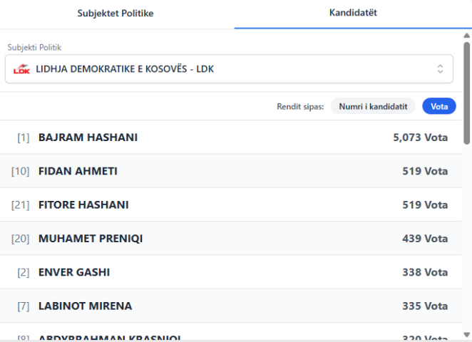 Bajram Hasani, si bartës liste i LDK’së ka marrë 5 mijë e 73 vota. Pas tij renditen Fidan Ahmeti me 519 vota, Fitore Hashani me 519 vota, Muhamet Preniqi me 439 vota dhe Enver Gashi me 338.