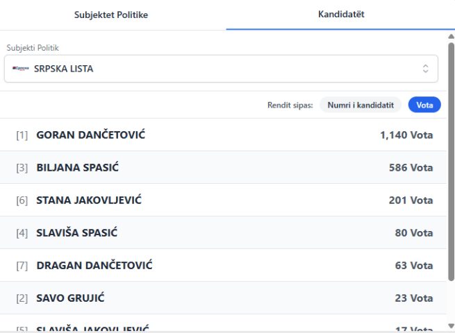 Nga Lista Serbe, Goran Dancetoviq si bartës liste ka marrë 1 mijë e 1140 vota. Pas tij renditen Biljana Spasiq me 586, Stana Jakovljeviq 201, Slavisha Spasiq me 90 dhe Dragan Danqetovic me 63.