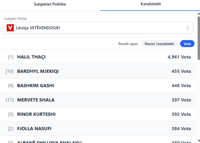 Si bartës liste i VV’së, Halil Thaçi ka marrë 4 mijë e 961 vota, i ndjekur nga Bardhyl Mjekiqi me 455, Bashkim Gashi me 446, Mervete Shala me 397 dhe Rinor Kurteshi me 392.
