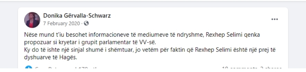 “Nëse mund t’ju besohet informacioneve të mediumeve të ndryshme, Rexhep Selimi qenka propozuar si kryetar i Grupit Parlamentar të VV-së. Ky do të ishte një sinjal shumë i shëmtuar, jo vetëm për faktin që Rexhep Selimi është një prej të dyshuarve të Hagës”, shkruante ajo.