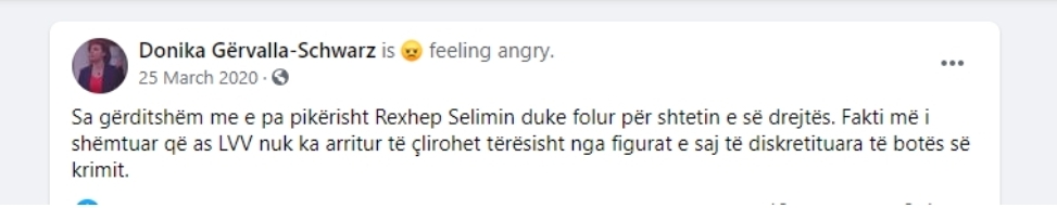 “Sa gërditshëm me e pa pikërisht Rexhep Selimin duke folur për shtetin e së drejtës. Fakti më i shëmtuar që as LVV nuk ka arritur të çlirohet tërësisht nga figurat e saj të diskredituara të botës së krimit”, kishte shkruar ajo.