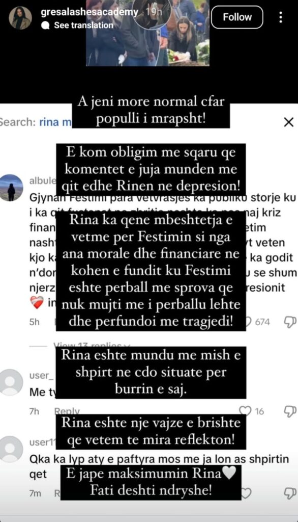 “A jeni more normal, çfarë populli i mbrapshtë!”, shkruan ajo me revoltë, duke theksuar se e ndjen për obligim të sqarojë se komentet e pamëshirshme mund ta shtyjnë edhe Rinën drejt depresionit.