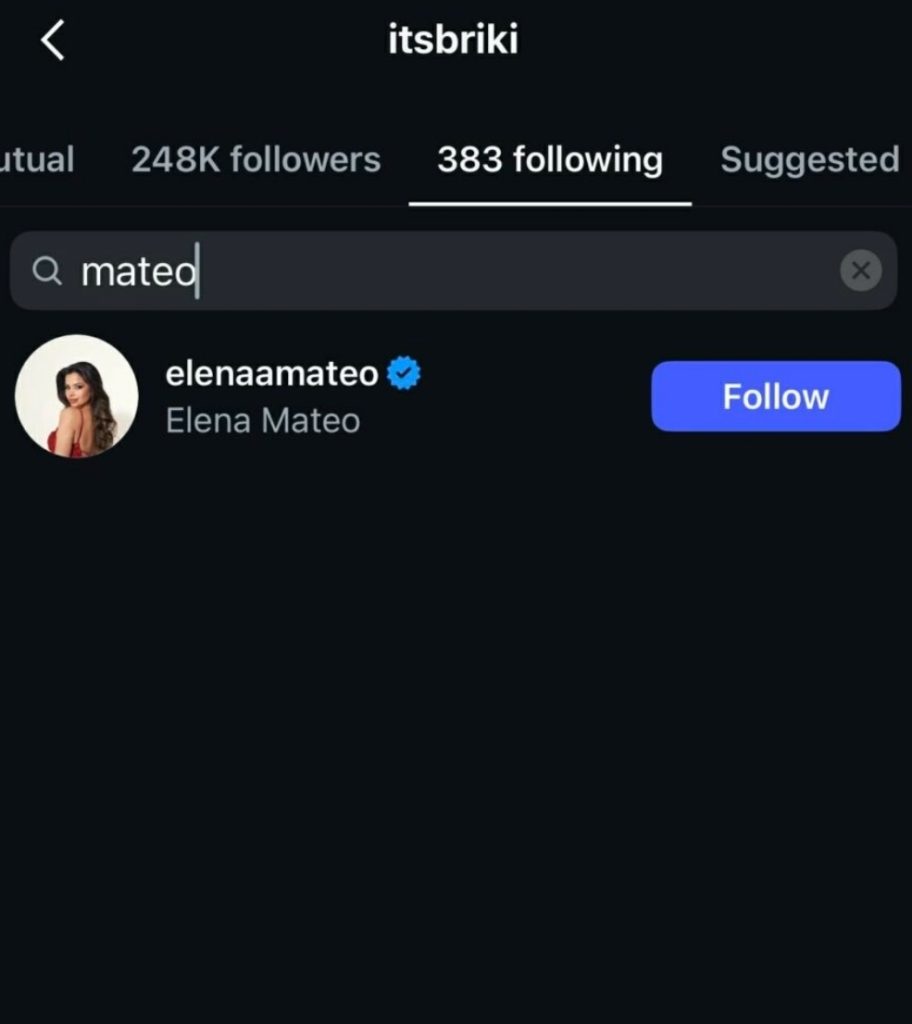 Po t’i hedhim sy profilit të Brikit në Instagram, bukuroshja bjonde nuk e ka në listën e ndjekësve edne Mateon.