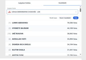 Kur janë numëruar 89.1% të votave për kandidatët për deputetë, në LDK prin Lumir Abdixhiku me 70,586 vota.