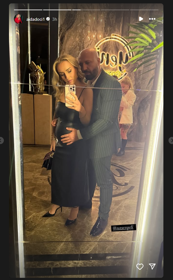 Aida shihet e lumtur krahë bashkëshortit, teksa ai ia mban duart në bark.