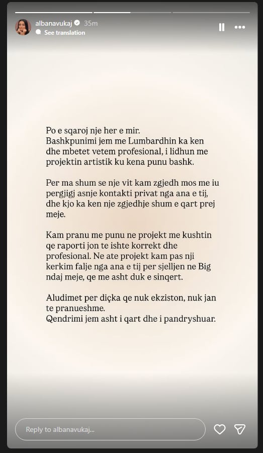 Ky reagim ka shuar çdo dyshim lidhur me natyrën e marrëdhënies së saj me Lumbardhin, duke theksuar se ajo është e angazhuar vetëm në aspektin profesional të punës së tyre së bashku.