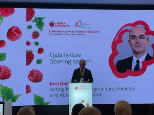 “Është nder i veçantë sot me ju të jem në konferencë konferenca e vetme nga sektori i bujqësisë që i bën 10 vite rrugëtimi tregon 0 vite sfida por më së shumti sukses. Është platformë e nivelit evropian, mjedra si një kulturë e re tregon një histori suksesi dhe shembull edhe për sektorët tjerë. Duke marrë si shembull për përfitime që po marrim nga njëri tjetri duke parë suksesin në sektorin e mjedrave por edhe sektorëve tjera që nga janari do të fillojmë me diskutime për konferencat në bujqësi. Do te jemi të parët në rajon për javën e konferencave të bujqësisë sepse këtë mundësi na fha natyre do të bëjmë investim në inovacion dhe zhvillim. Përkrahja jonë si Qeveri duhet të vazhdojë tutje me fokus të shtuar, falë këtij angazhimi sot bujqësia është e fortë. Mbi 1 milionë hektarë me mjedër. Interesi për këtë kulturë po rritet vazhdimisht fermerët kanë pare qartë se sektori i mjedrës ka stabilitet financiar.