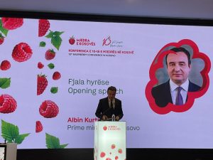 “Këtu kemi mbi 350 pjesëmarrës, kjo sallë tregon që frutat e më nuk është kulturë e vogël por është me ndikim. Janë edhe 30 fermerë nga Shqipëria që kanë marrë model fermerët e Kosovës. Kosova e sotme është histori suksesi që po forcohet nga viti në vit një vend më i sigurt në Evropë me sundim të ligjit në rritje kjo performancë nuk është rastësi është rezultat i reformave të qëndrueshme dhe përfshirje reale e të gjitha komuniteteve. Me rritje ekonomike solide sistem financiar të kapitalizuar dhe me paqe dhe siguri. Kjo klime stabiliteti është arsyeja qe sektori i frutave të imta po gjen tregje të reja dhe kontrata afatgjata. Thuhet se sekrete i suksesi në fermë është kombinimi i tokave pjellore dhe politikat e mençura. Sot Kosova ka ngritur një zinxhir të plotë me fruta të imëta nga punishtet në qendrat punese të cilët e kanë shndërruar bashkëpunimin në avantazh për shkak se punojmë më shumë. Dikur rreth 96 për qind i prodhimit tonë eksportohet sot falë rritjes së ndjeshme dhe orientimi drejtë ushqimit të shëndetshëm është eksporti rreth 75 për qind. Familjet tona po konsumojnë më shumë produkte vendore, unë si kryeministër jemi të interesuar t’iu mbështesim më shumë. Shumica e produktit shkon për eksport duke gjeneruar 10 milionë euro”, tha Kurti.