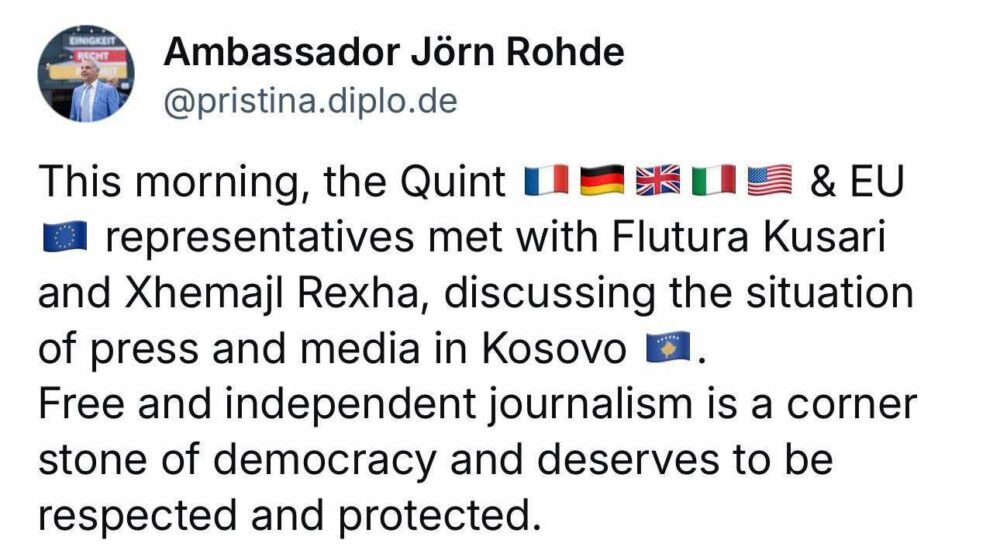 Ambasadori gjerman në Kosovë, Jörn Rohde, ndau detaje nga ky takim përmes një postimi në rrjetin social X, duke theksuar rëndësinë e gazetarisë së lirë dhe të pavarur si një shtyllë bazë e çdo sistemi demokratik.