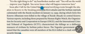 Në parathënien e këtij libri, Arovska kishte shkruar se sulmet e UÇK-së dhe ato serbe kulmuan në incidentin e Reçakut më 15 janar 1999 në qendër të Kosovës. Raporte të ndryshme, përfshirë ato të Human Rights Watch, Organizata për Siguri dhe Bashkëpunim në Evropë (OSBE) dhe Tribunali Ndërkombëtar i Krimeve të Jugosllavisë, i kanë karakterizuar vrasjet si masakër të qëllimshme të civilëve nga forcat policore serbe. Qeveria jugosllave deklaroi se të rënët të gjithë ishin anëtarë të UÇK-së dhe ishin vrarë në luftimet me forcat e sigurisë”, ka shkruar ajo në njërën nga faqet e parathënies së librit.