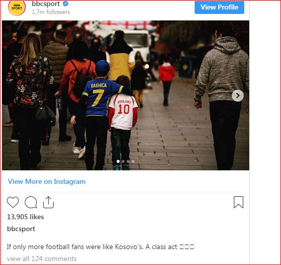 “Sikur të kishte më shumë tifozë të futbollit si ata të Kosovës. Një vepër klasi”, shkruan në postimin e faqes zyrtare të BBC Sport në Instagram.