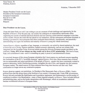 “Kërkoj heqjen e menjëhershme dhe të pakushtëzuar të të gjitha masave të BE-së ndaj Kosovës”, duke shtuar se një vendim i tillë do të ishte sinjal i drejtpërdrejtë për qytetarët se përpjekjet e tyre demokratike po njihen dhe po mbështeten./Nacionale