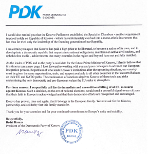 Në një letër drejtuar Presidentes së Komisionit Europian, Ursula von der Leyen, kryetari i PDK-së, Bedri Hamza, ka kërkuar heqjen e menjëhershme dhe të pakushtëzuar të masave të BE-së ndaj Kosovës, duke argumentuar se Kosova ka përmbushur çdo standard demokratik dhe ka bërë sakrifica të mëdha për integrimin europian.