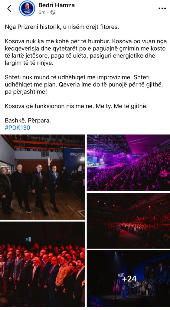 Lideri i PDK-së, Bedri Hamza, njëherësh kandidat i kësaj partie për kryeministër, ka thënë se Kosova po vuan nga keqqeverisja dhe qytetarët po e paguajnë çmimin me kosto të lartë jetësore, paga të ulëta, pasiguri energjetike dhe largim të të rinjve.