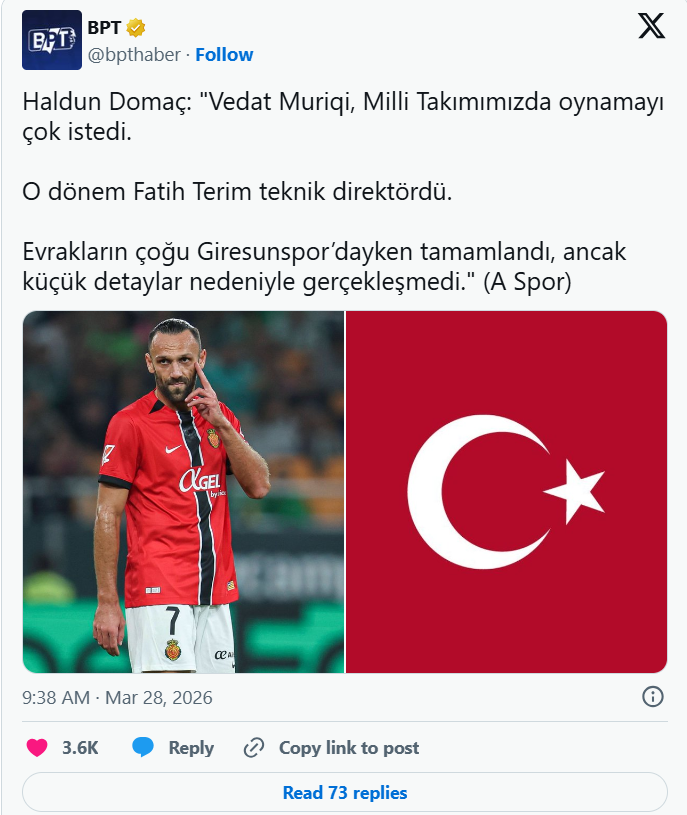 Ylli i Mallorcas Vedat Muriqi vite më parë kishte shprehur dëshirë për të përfaqësuar Turqinë në nivelin ndërkombëtar, kështu ka deklaruar komentatori i A Spor Haldun Domaç.