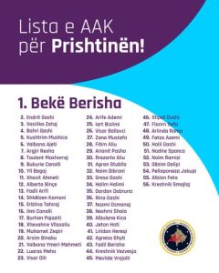 Kandidati për kryetar të Prishtinës nga radhët e AAK-së, Bekë Berisha, ka publikuar listën e kandidatëve të kësaj partie për asamblenë komunale të kryeqytetit.
