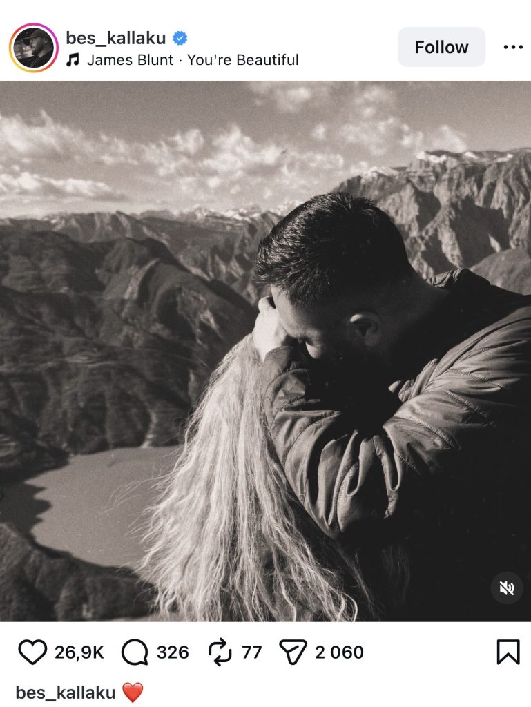 Në imazhin e ndarë me ndjekësit, vajza mbetet ende misterioze pasi nuk i dallohet fytyra, por bien në sy flokët e saj të gjata bjonde, ndërsa Besi shihet duke i dhuruar një puthje. Postimi është shoqëruar vetëm me një emoji zemre, gjë që ka mjaftuar për të nxitur reagime të shumta dhe urime nga fansat.