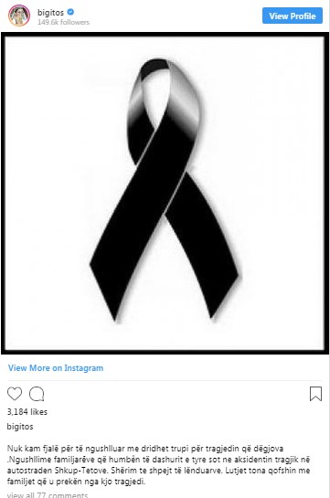 “Nuk kam fjalë për të ngushëlluar me dridhet trupi për tragjedinë që dëgjova .Ngushëllime familjareve që humbën të dashurit e tyre sot ne aksidentin tragjik në autostradën Shkup-Tetove. Shërim te shpejt të lënduarve. Lutjet tona qofshin me familjet që u prekën nga kjo tragjedi”, ka shkruar këngëtarja.