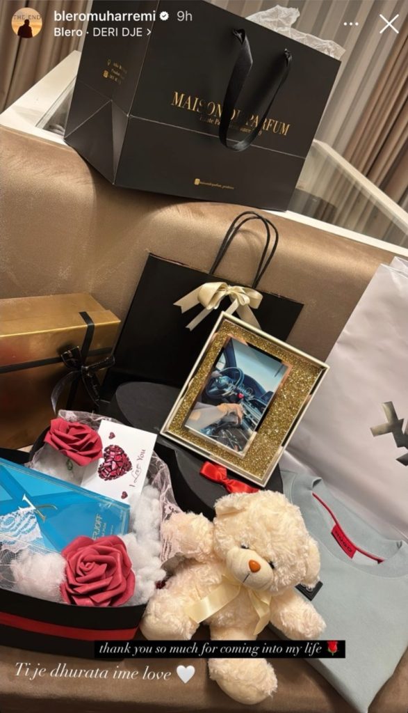 Në një foto të postuar në Instagram Story, ai ka treguar një mal me dhurata për partneren e tij – parfume, kuti me dhurata të zbukuruara, arushë lodër, lule, kornizë me foto intime dhe kartolina dashurie.