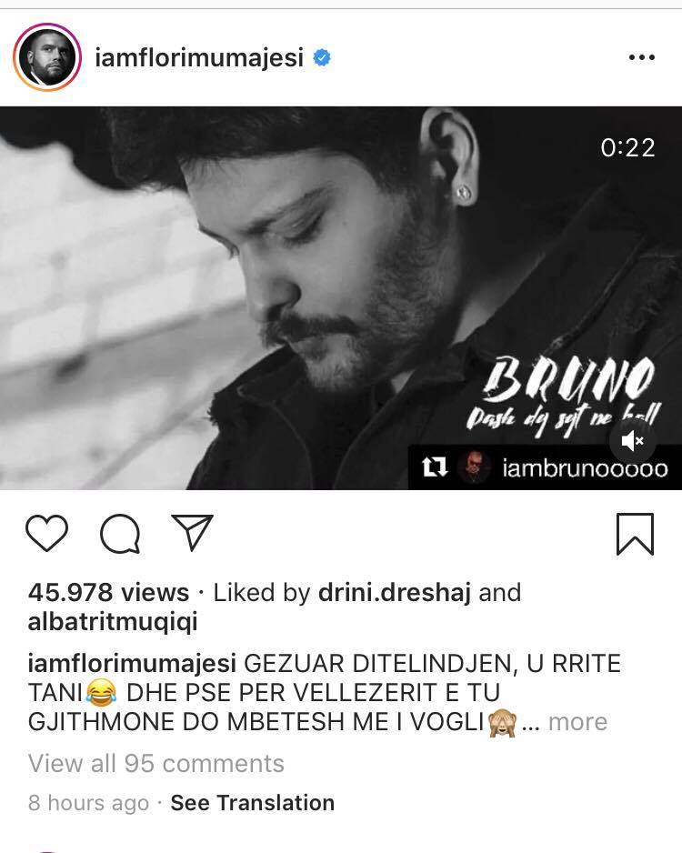 Një urim special ia bëri Flori Mumajesi, i cili publikoi një pjesë të shkurtër nga coveri i “Pash dy sytë”, që e këndoi së fundi Bruno, shkruan lajmi.net.