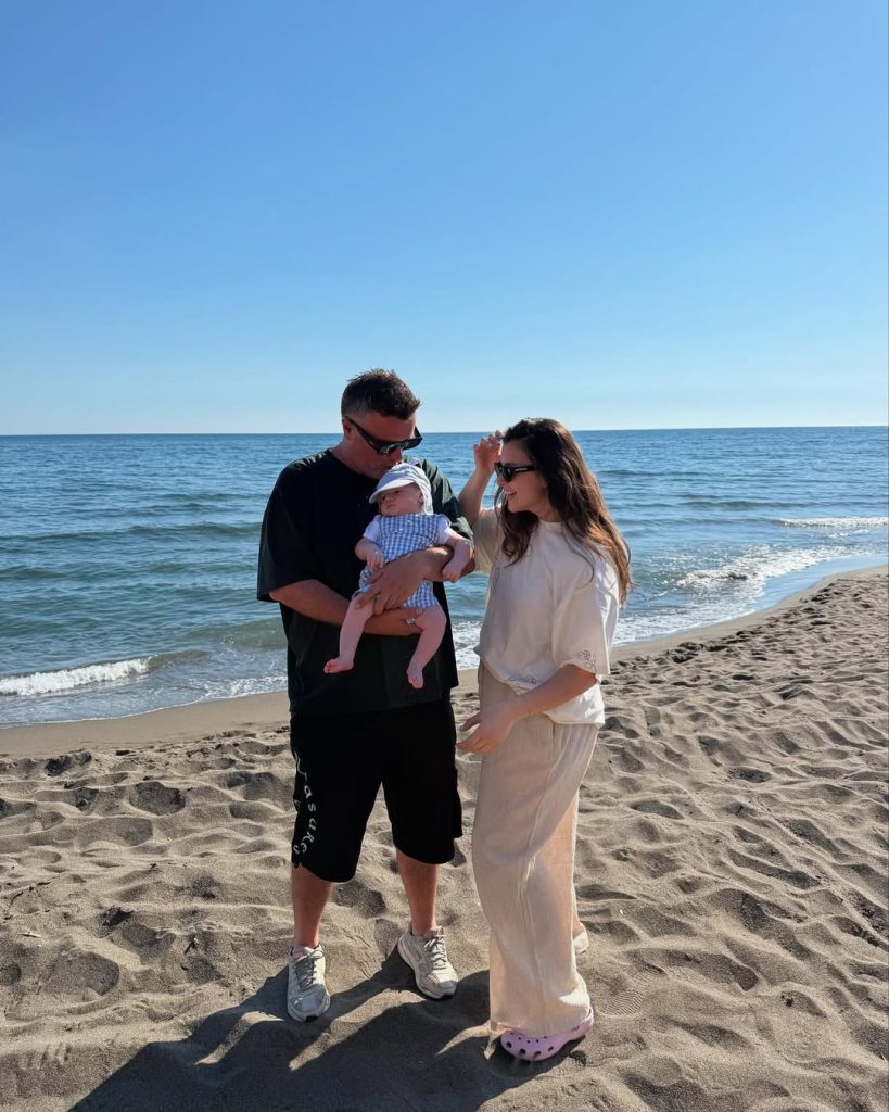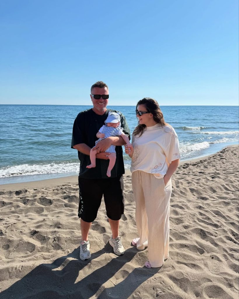 Në imazhet e publikuara shfaqet i qeshur dhe i lumtur pranë vogëlushit Elio, ndërsa shijojnë ditët e para të relaksit pranë detit.
