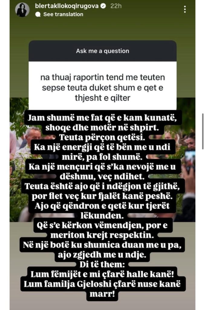 Ndërkohë, një tjetër ndjekës e ka pyetur për raportin e saj me Teutën, kunatën e saj të sapomartuar. Blerta është shprehur me superlativa për të, duke e quajtur “shoqe, motër në shpirt” dhe duke theksuar qetësinë, mençurinë dhe përulësinë e Teutës. Ajo shtoi se në një botë ku shumica duan të duken, Teuta zgjedh të ndihet, duke e përshkruar si një person që “qëndron e qetë kur të tjerët lëkunden”.