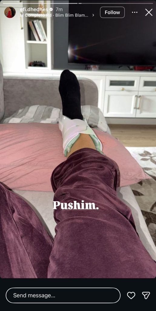 Në foton e publikuar në Story, Efi shfaqet e shtrirë në shtëpi, teksa vëmendjen kryesore e merr këmba e saj e fashuar.