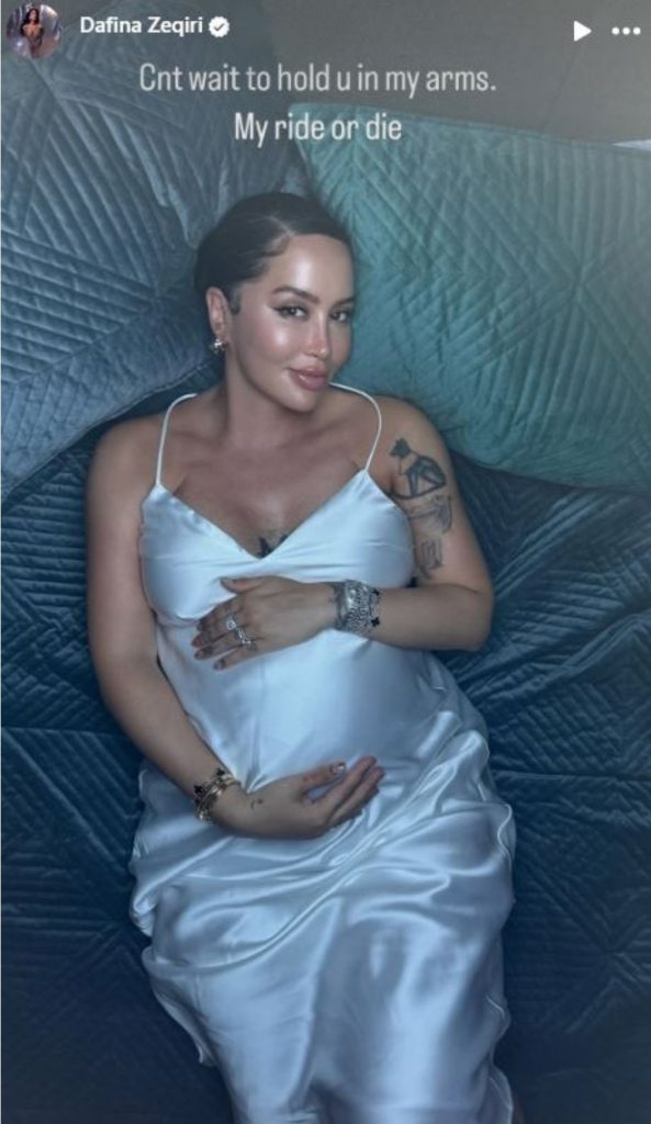 Në një fotografi të publikuar në Instagram, Dafina shfaqet e qetë dhe rrezatuese, ndërsa përqafon barkun e saj të rrumbullakosur me përkujdesje e dashuri.