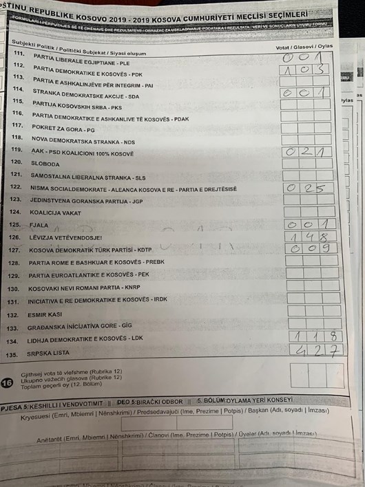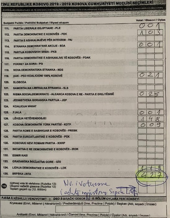 Disa fotografi që po qarkullojnë nëpër rrjetet sociale, e të cilat shfaqin një rast konkret ku vetëm në një vendvotim në komunën e Vushtrrisë të gjitha votat e qytetarëve që kanë votuar në atë qendër i janë dhënë Listës Serbe.