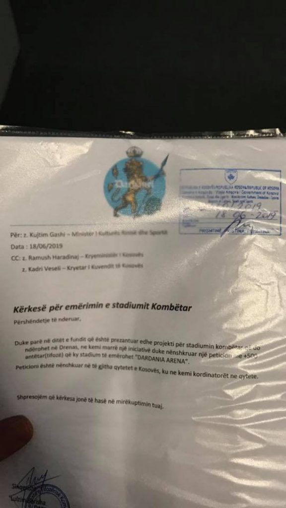 “Gjatë javës, në të gjitha qytetet e Kosovës së bashku me kordinatorët tanë dhe anëtarët e tifo grupit kemi nënshkruar një peticion që stadiumi kombëtar që u prezantua javën e kaluar të emërohet ‘Dardania Arena’. Shpresojmë, që kërkesa jonë të miratohet”, thuhet në njoftim.