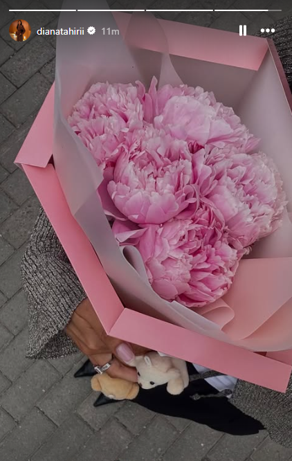 Në një Instastory të publikuar së fundmi, ajo shfaqet duke mbajtur një buqetë luksoze me lule pion të ngjyrosura në rozë të butë, të vendosura brenda një kutie rozë elegante.