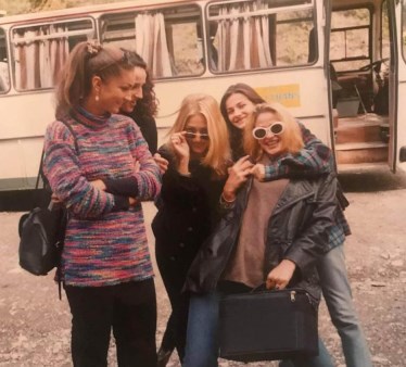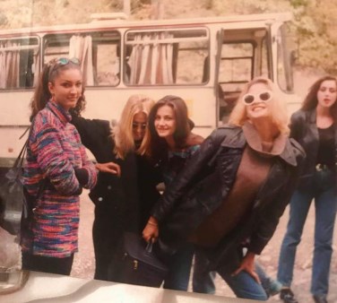 “Une 17 vjeqe (gjithe me qendrim si me i pas 50) me mikeshat e mija LeonoraIberdemaj, arbresha Arbëresha ArifiTeli, Blerta SylaSurroi, Mimoza Kryeziu gjate pregaditjeve per ” Miss Kosova 96″ autobusi nuk eshte aj qe po mendoni