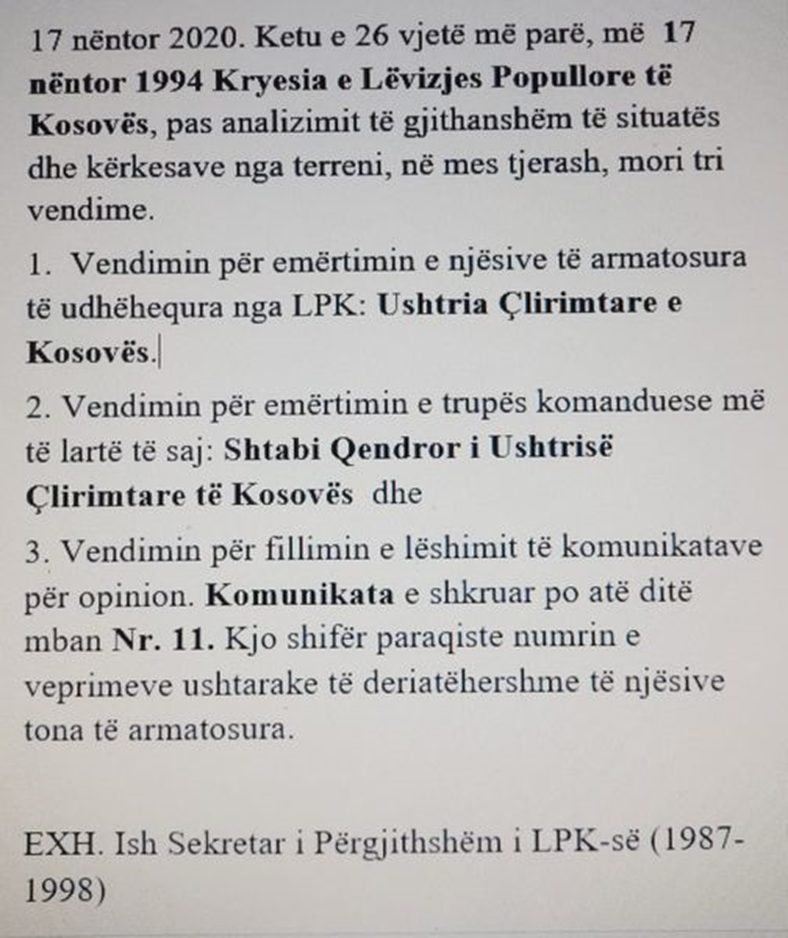 Komunikata e shkruar po atë ditë mban numër 11, shifër kjo që paraqiste numrin e veprimeve ushtarake të deriatëhershme të njësive të saja të armatosura, shkruan Emrush Xhemajli, ish-sekretar i përgjithshëm i LPK-së nga viti 1987 deri më 1998, në një postim në Facebook.