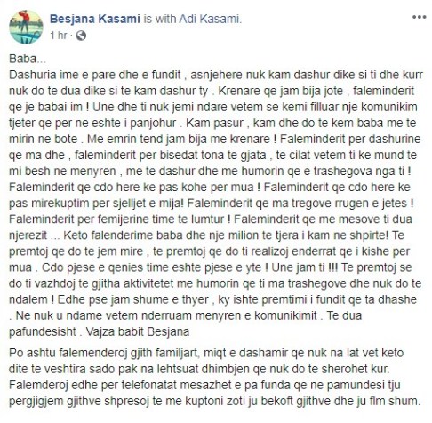 Dashuria ime e pare dhe e fundit , asnjehere nuk kam dashur dike si ti dhe kurr nuk do te dua dike si te kam dashur ty . Krenare qe jam bija jote , faleminderit qe je babai im ! Une dhe ti nuk jemi ndare vetem se kemi filluar nje komunikim tjeter qe per ne eshte i panjohur . Kam pasur , kam dhe do te kem baba me te mirin ne bote . Me emrin tend jam bija me krenare ! Faleminderit per dashurine qe ma dhe , faleminderit per bisedat tona te gjata , te cilat vetem ti ke mund te mi besh ne menyren , me te dashur dhe me humorin qe e trashegova nga ti ! Faleminderit qe cdo here ke pas kohe per mua ! Faleminderit qe cdo here ke pas mirekuptim per sjelljet e mija! Faleminderit qe ma tregove rrugen e jetes ! Faleminderit per femijerine time te lumtur ! Faleminderit qe me mesove ti dua njerezit … Keto falenderime baba dhe nje milion te tjera i kam ne shpirte! Te premtoj qe do te jem mire , te premtoj qe do ti realizoj enderrat qe i kishe per mua . Cdo pjese e qenies time eshte pjese e yte ! Une jam ti !!! Te premtoj se do ti vazhdoj te gjitha aktivitetet me humorin qe ti ma trashegove dhe nuk do te ndalem ! Edhe pse jam shume e thyer , ky ishte premtimi i fundit qe ta dhashe . Ne nuk u ndame vetem nderruam menyren e komunikimit . Te dua pafundesisht . Vajza babit Besjana