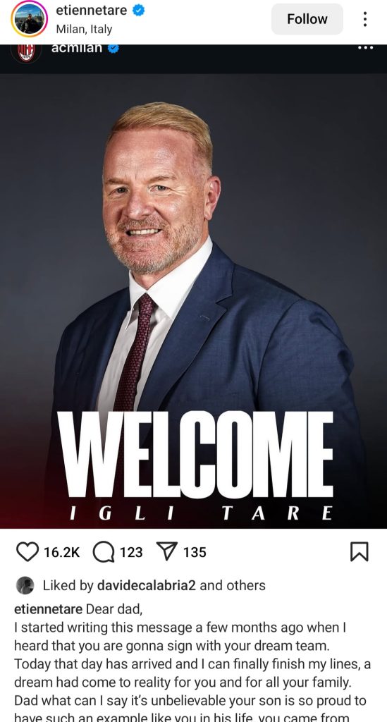 Djali i Igli Tares me urim special për babain, pasi u emërua drejtor sportiv i Milanit