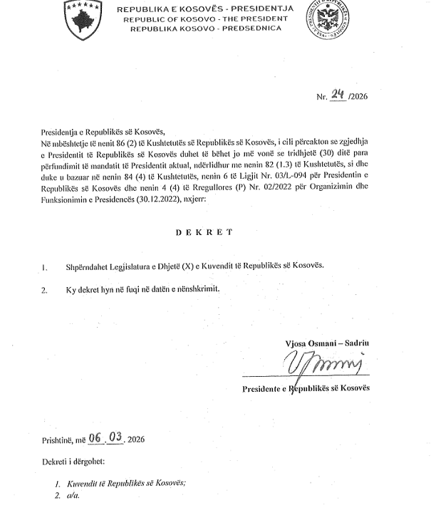 Presidentja Vjosa Osmani sot nënshkroi dekretin për shpërndarjen e Kuvendit pasi ai dështoi të zgjidhte Presidentin e ri brenda afatit.
