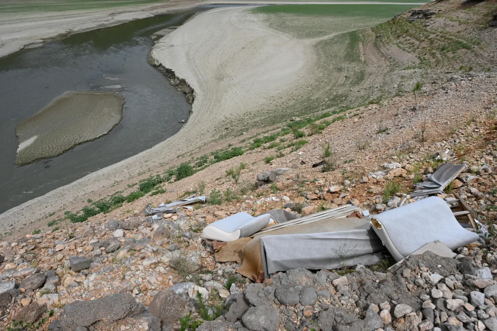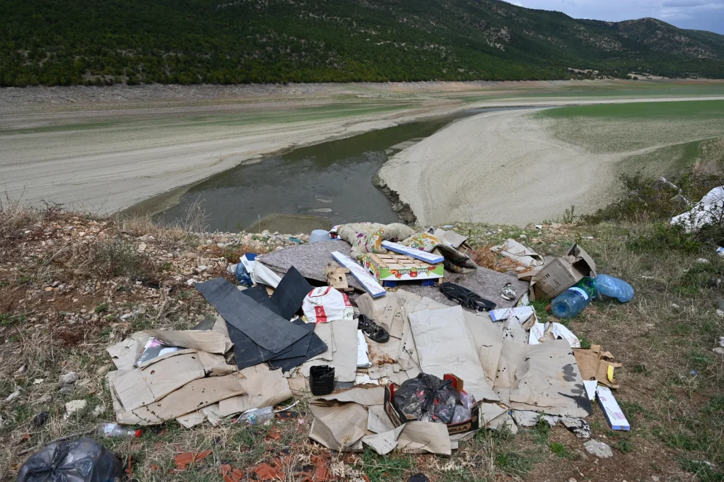 Ajo çfarë mpakja e ujit gjatë verës lë pas është një mori mbetjesh, shumica prej tyre plastike të varura në shpatet e anësoreve të liqenit, tanimë të tkurrura nga rrezet e diellit.