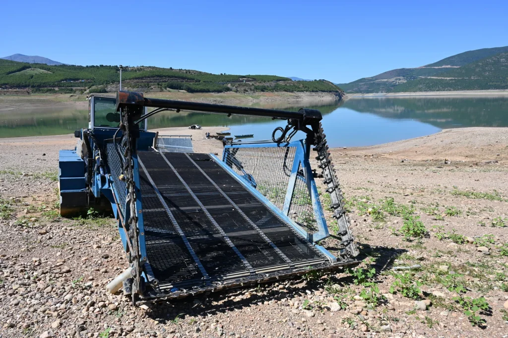 Varka për mbledhjen e mbetjeve plastike në liqenin e Fierzës, gjatë aktivitetit dhe e ankoruar në breg gjatë verës. | Foto: Erisa Kryeziu