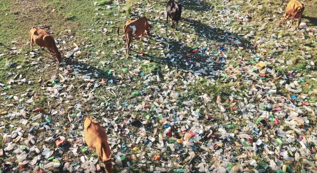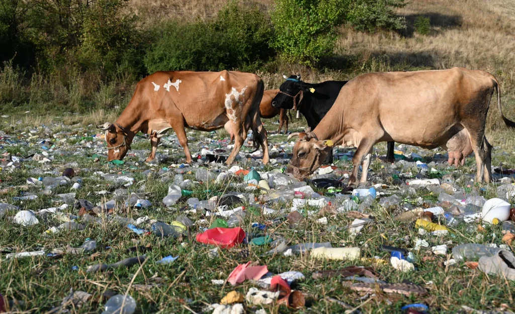 Mirëpo, në vend të barit dhe kullotës së pastër, lopët e djemve ecnin mbi një shtresë unifikuese mbetjesh plastike, në tentativë për të prekur mbi bar.