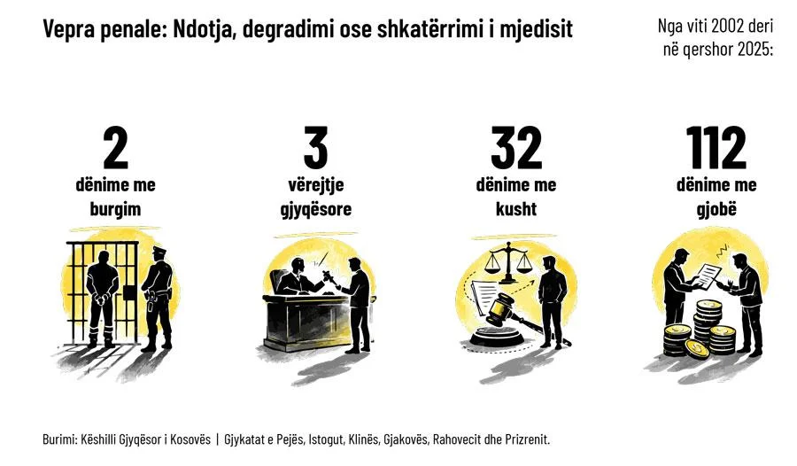 Dënimet për ata që e ndotin dhe degradojnë mjedisin janë kryesisht me kusht ose me gjoba. Preportr ka marrë të dhënat për llojet e dënimeve që kanë marrë gjykatat në komunat ku kalon Drini i Bardhë si ajo e Pejës, Istogut, Klinës, Gjakovës, Rahovecit dhe Prizrenit. Kërkesa ka qenë specifike vetëm me veprat që ndërlidhën me Drinin e Bardhë, por nga Këshilli Gjyqësor i Kosovës (KGjK) nuk bëhet një kategorizim i tillë. Sipas të dhënave të KGjK-së, nga gjykatat e lartcekura, nga viti 2002 deri në qershor 2025 janë dhënë vetëm dy dënime me burgim, 112 dënime me gjobë, 32 me kusht dhe tri vërejtje gjyqësore. Kjo tregon për dënime të buta për degraduesit e mjedisit.