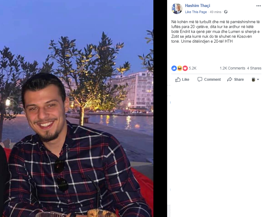 “Në kohën më të turbullt dhe më të pamëshirshme të luftës para 20 vjetëve, dita kur ke ardhur në këtë botë Endrit ka qenë për mua dhe Lumen si shenjë e Zotit se jeta kurrë nuk do të shuhet në Kosovën tonë. Urime ditëlindjen e 20-të!”- ka shkruar Thaçi./ORAinfo/