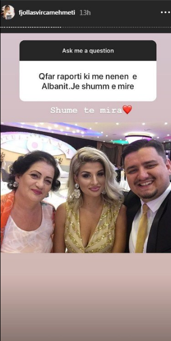 Dhe në pyetjen për raportin me vjehrrën, ajo ka treguar se ka raport shumë të mirë me nënën e Albanit./ORAinfo/