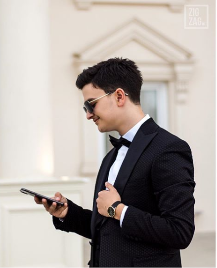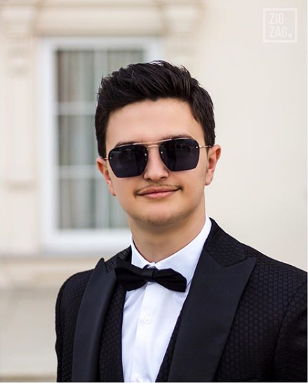 I veshur me kostum të zi dhe me syze, Pëllumbi duket se ka shkëlqyer në mbrëmjen e maturës.