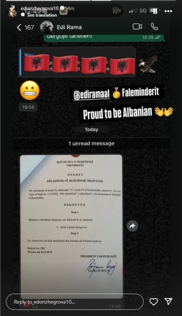 Ylli i Kosovës, Edon Zhegrova është pajisur me pasaportën e Shqipërisë dhe këtë e ka konfirmuar vetë me anë të një ‘story’ në profilin e tij privat në Instagram, duke i rritur kështu mundësitë e një kalimi nga Lille te Juventusi.