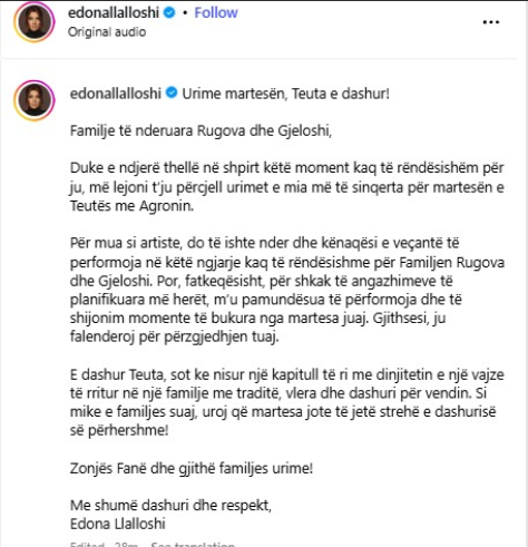 Por, pavarësisht dëshirës për të qenë pjesë e mbrëmjes dhe ndjesisë së nderit nga kjo ftesë, Edona e kishte datën tashmë të zënë me një angazhim të mëhershëm dhe nuk mundi të merrte pjesë.